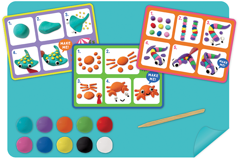 Med 10 flotte farver lufttørrende ler, instruktionskort, en praktisk træpen og en silikonemåtte til at forme på, kan børnene lave op til 10 unikke figurer – alt fra glade fisk til venlige skildpadder. Leret er blødt og let at arbejde med, tørrer i luften og kræver ingen ovn – perfekt til små hænder og store idéer.