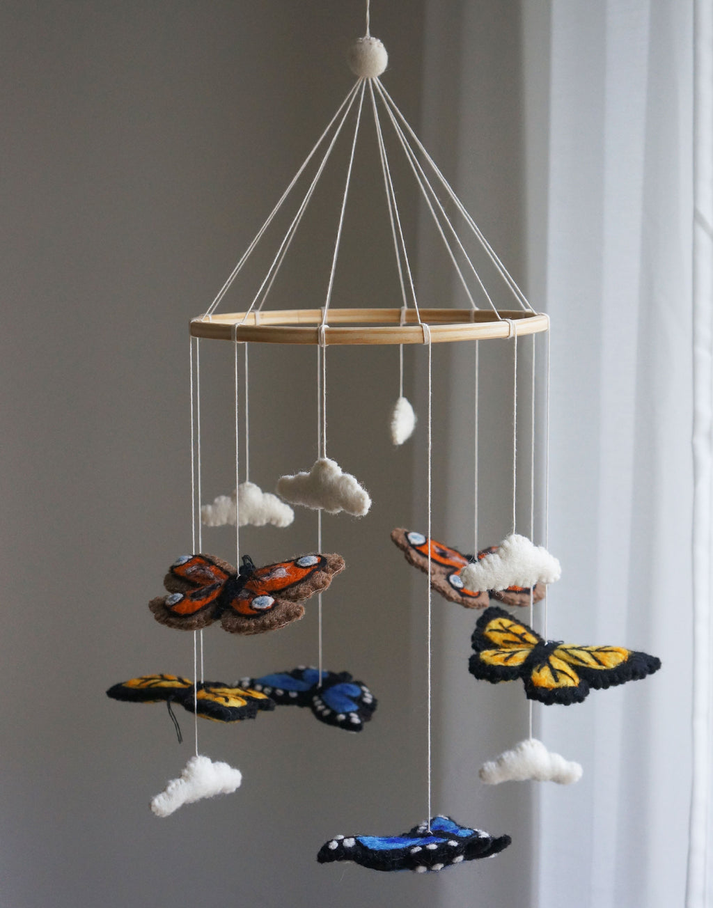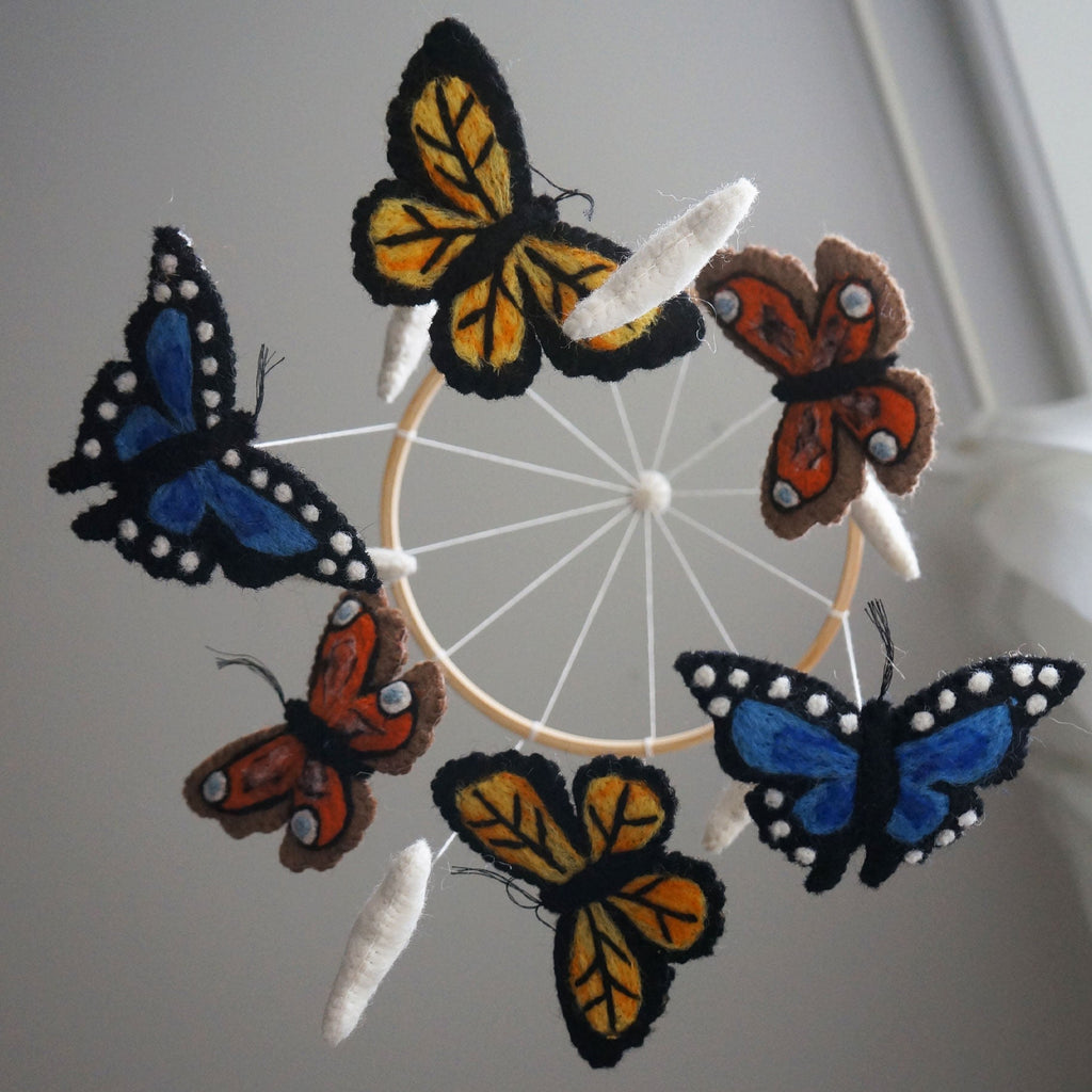 Gamchas uroer bringer en helt særlig magi ind på børneværelset. De er håndlavet af kvinder i Nepal, og hver lille filtfigur rummer fine detaljer og et udtryk, der emmer af varme og nærvær. Når uroen bevæger sig stille i luften, skaber den et blidt visuelt fokuspunkt, som babyen kan fordybe sig i – perfekt til at stimulere sanserne på en rolig og naturlig måde.