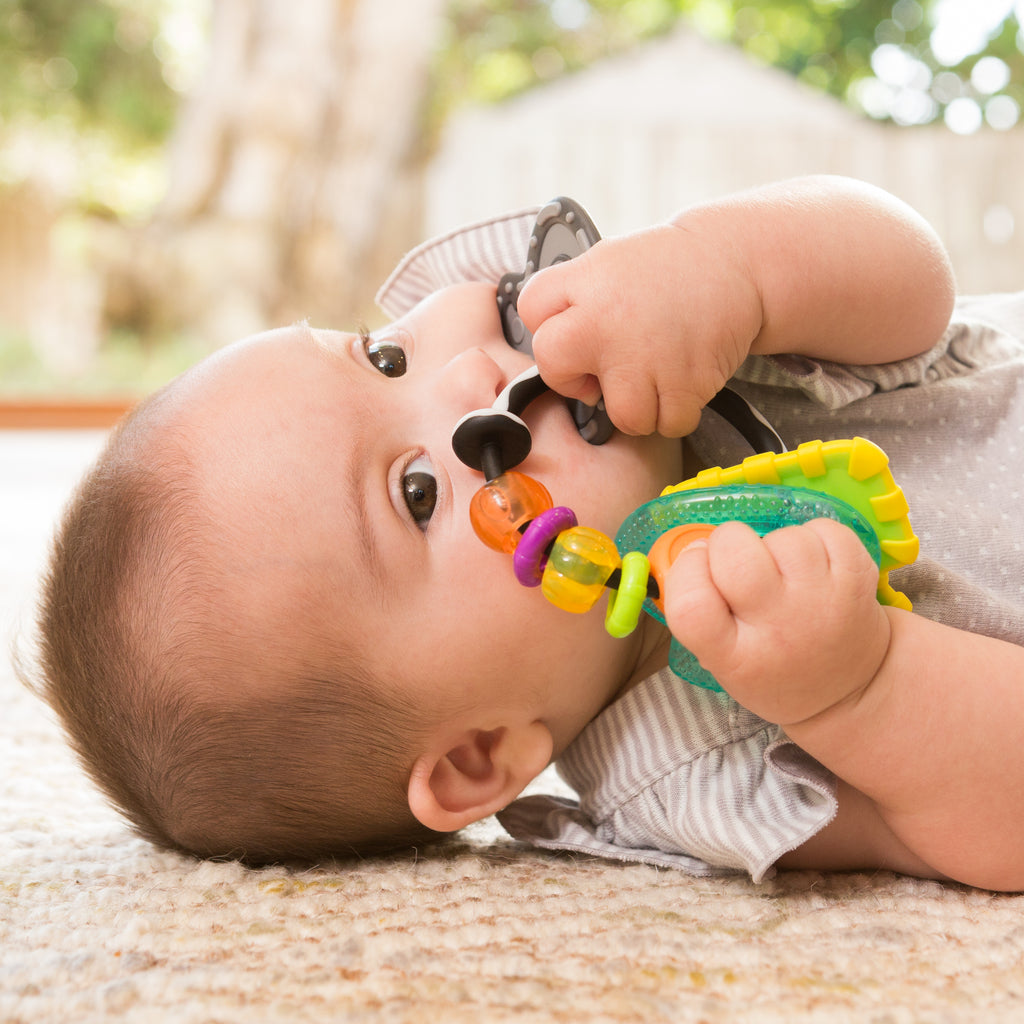 De bløde bideringe er ideelle til at lindre ømme gummer, mens de klirrende nøgler giver sjove lyde, når baby leger og ryster dem. Ranglen er let at gribe for små fingre og perfekt til både leg og lindring på farten.