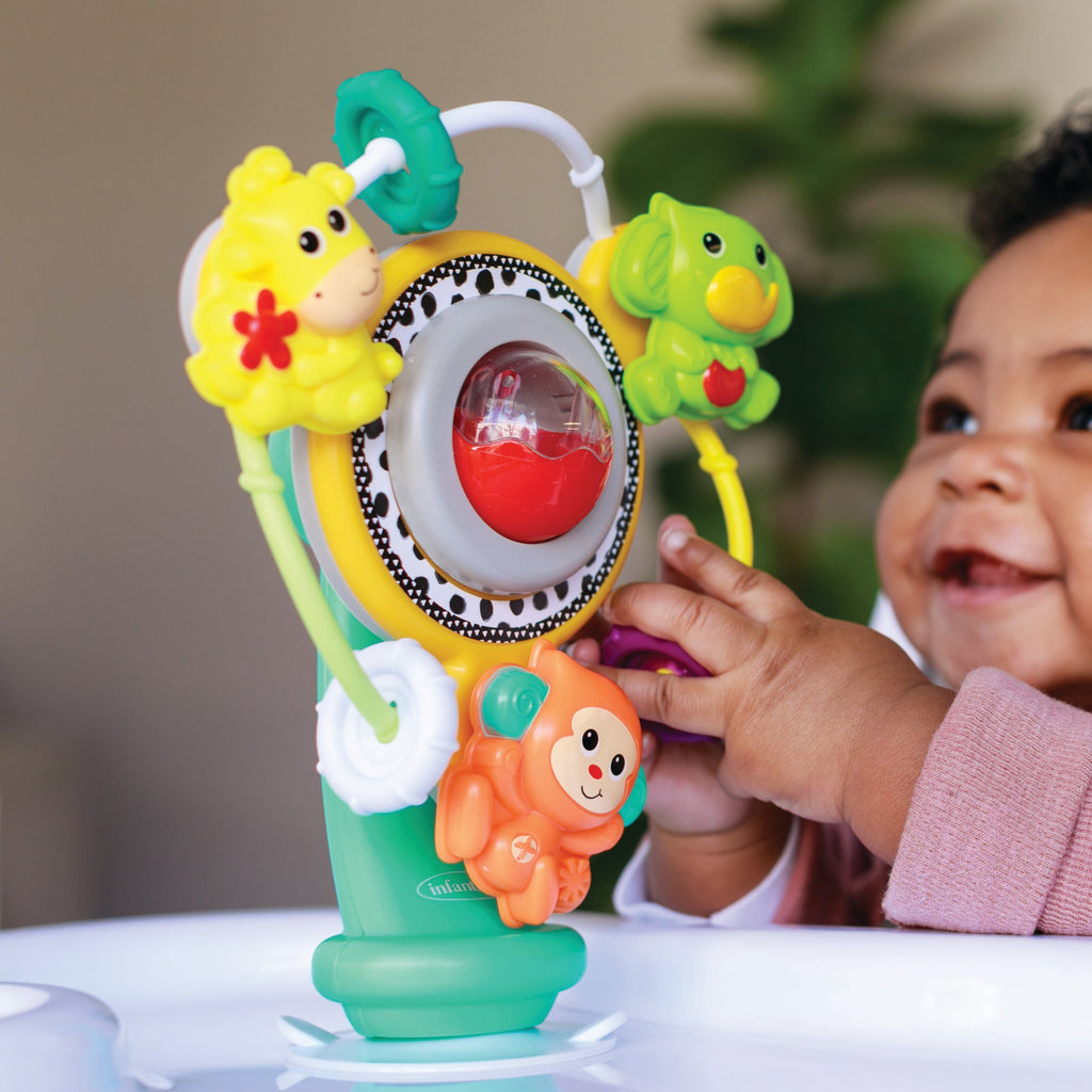 Drej, leg og udforsk med dette farverige pariserhjul fra Infantino, hvor sjove jungledyr følger med på turen! De glade figurer – elefant, abe og giraf – bevæger sig, når hjulet drejes, og den gennemsigtige kugle i midten fanger barnets opmærksomhed med spændende bevægelser og lyde.