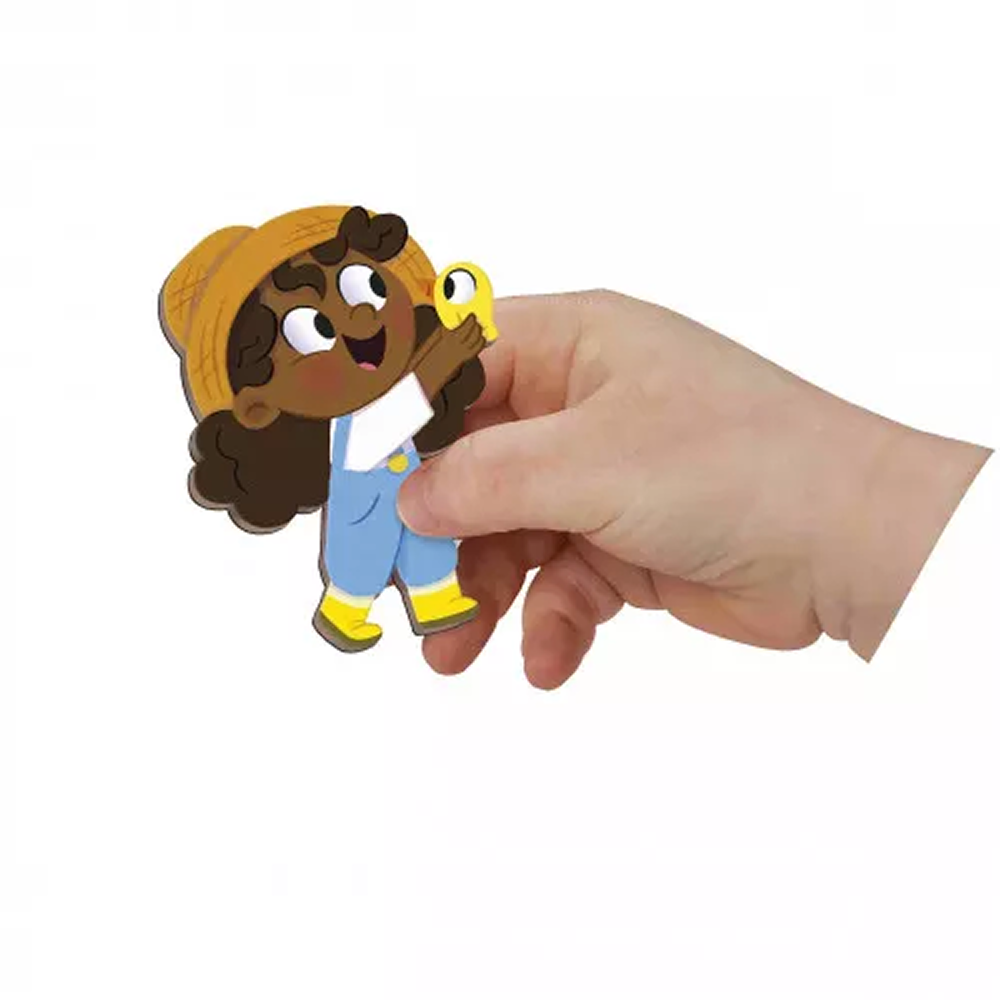 Med 30 farverige magneter og en flot, opretstående baggrund kan barnet bygge nye bondegårdsscener igen og igen. Dyrene kan lege på marken, bonden kan arbejde, og hver leg bliver til en ny fortælling. Den lille scene gør det nemt for barnet at vise og fortælle sine historier – både alene og sammen med andre.