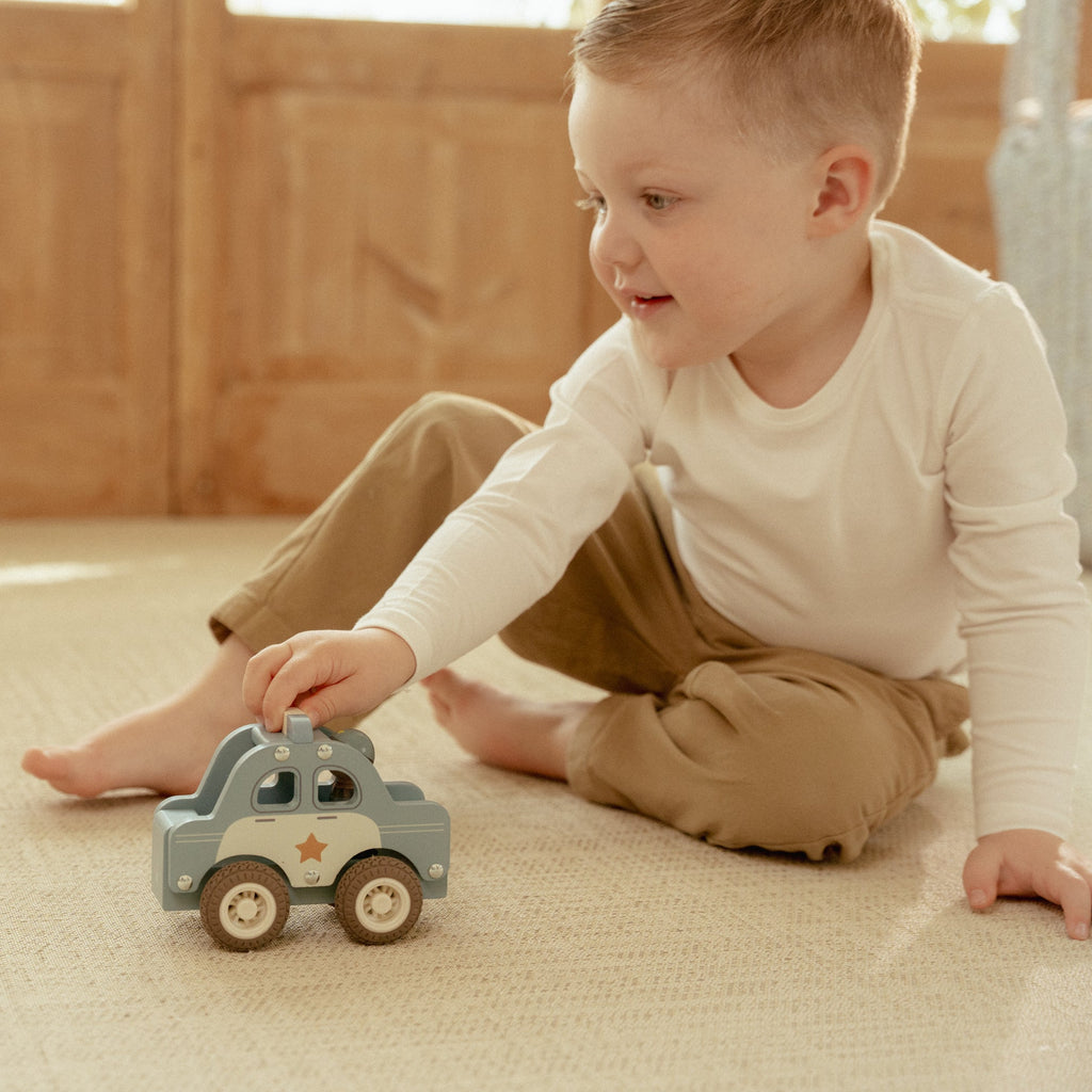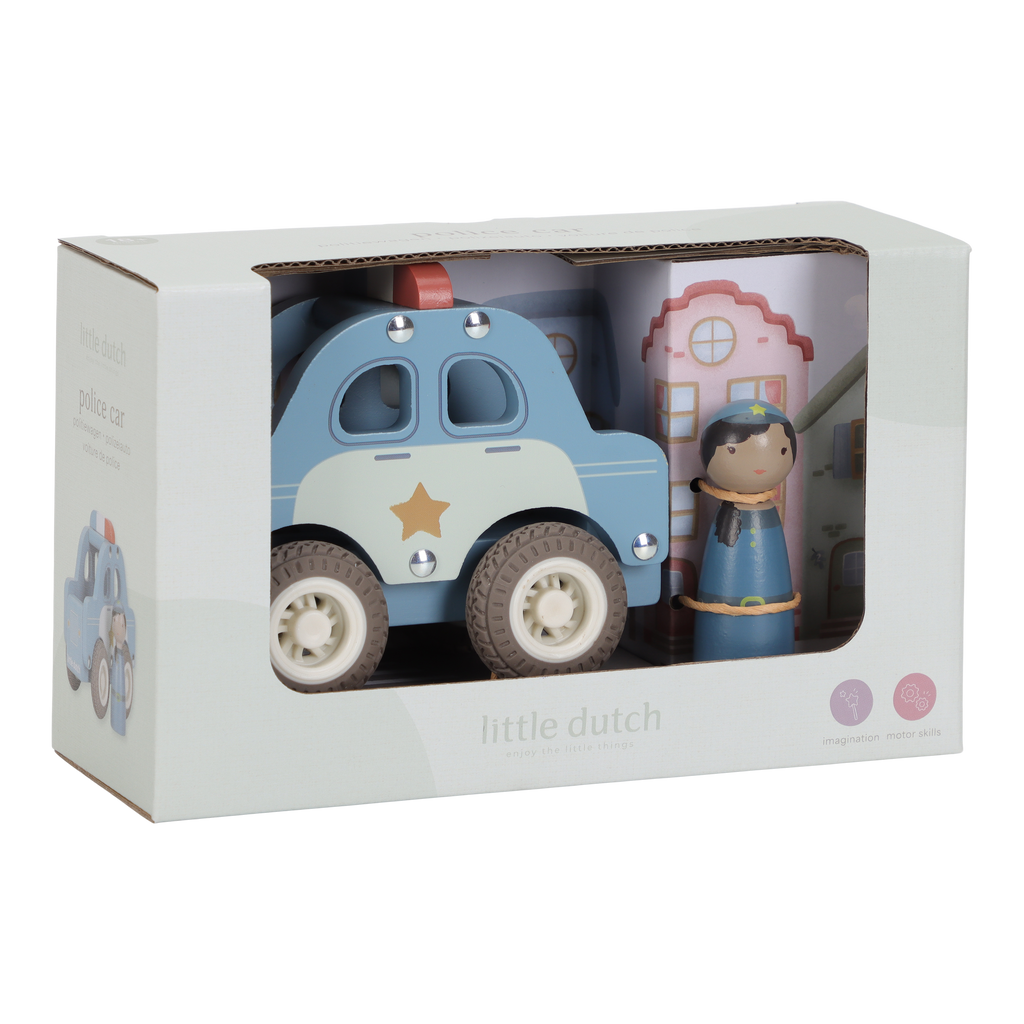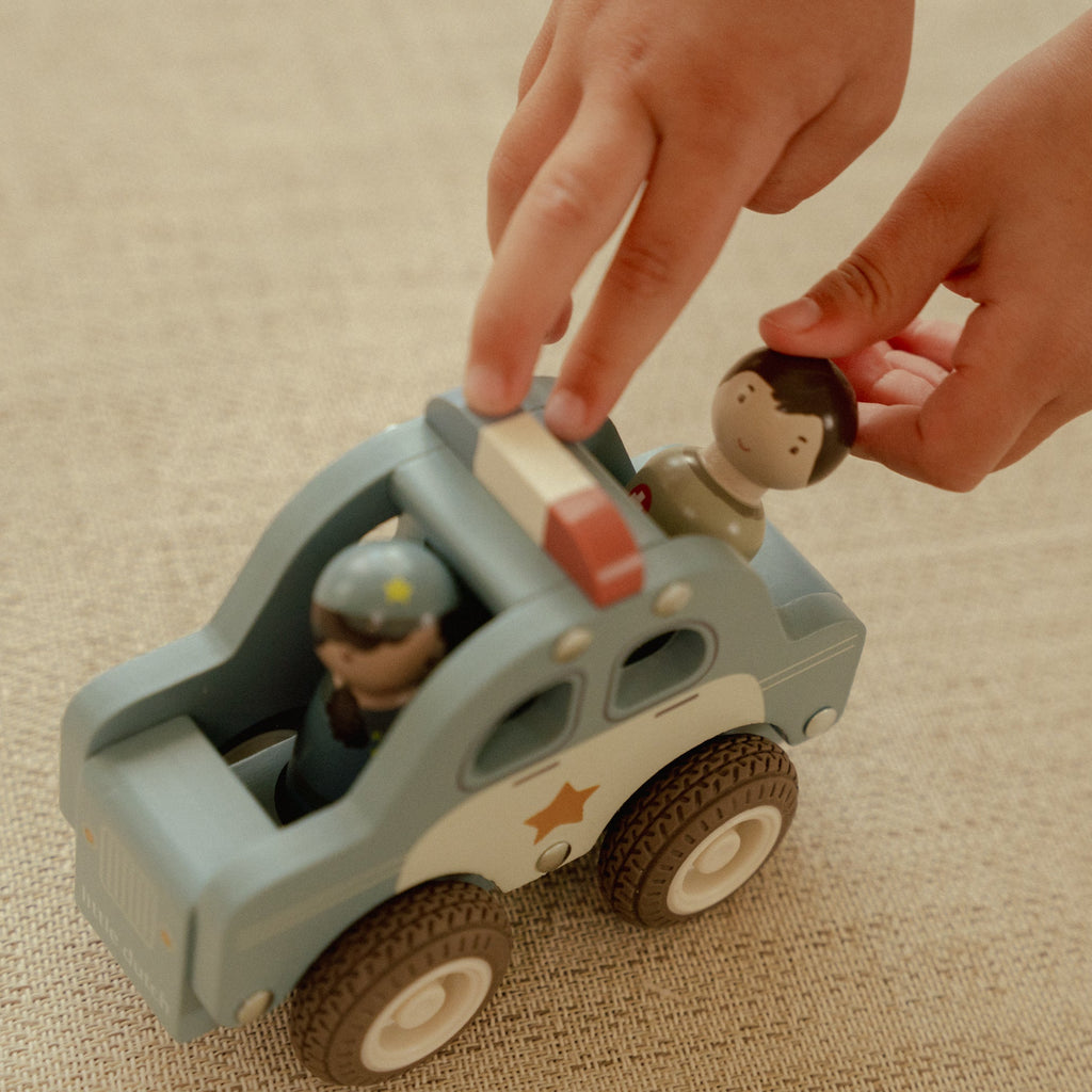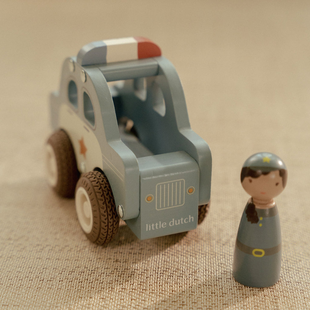 Denne robuste politibil i træ suser afsted, når der opstår en nødsituation i byen. De bløde gummihjul sikrer en jævn og lydsvag kørsel, mens den seje politibetjent bag rattet er parat til at holde ro og orden.