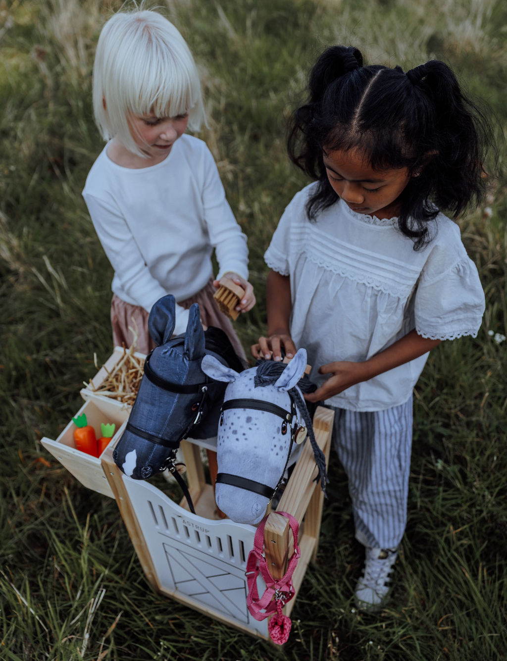 Hesteboksen passer til alle kæpheste, uanset længden på pinden, og leveres med et smart fodertrug/høhæk, så de firbenede venner altid har “mad” inden for rækkevidde. Selvom lågen er fast, gør det åbne, robuste design det let for børnene at sætte kæphestene på plads og tage dem frem igen, når legen kalder.