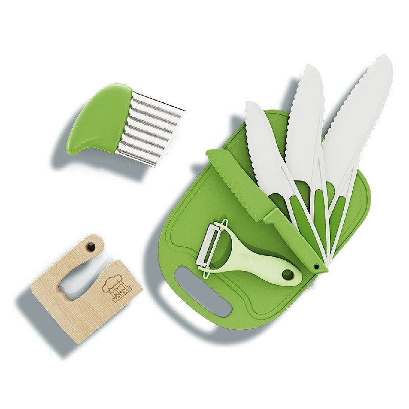 4 børnevenlige knive med skridsikkert greb til frugt og grønt, en skræller til gulerødder og agurker, en bølgekniv til sjove mønstre, en trækniv til bløde fødevarer som banan og avocado samt et praktisk skærebræt i børnestørrelse – alt, hvad en lille kok har brug for til at komme i gang.