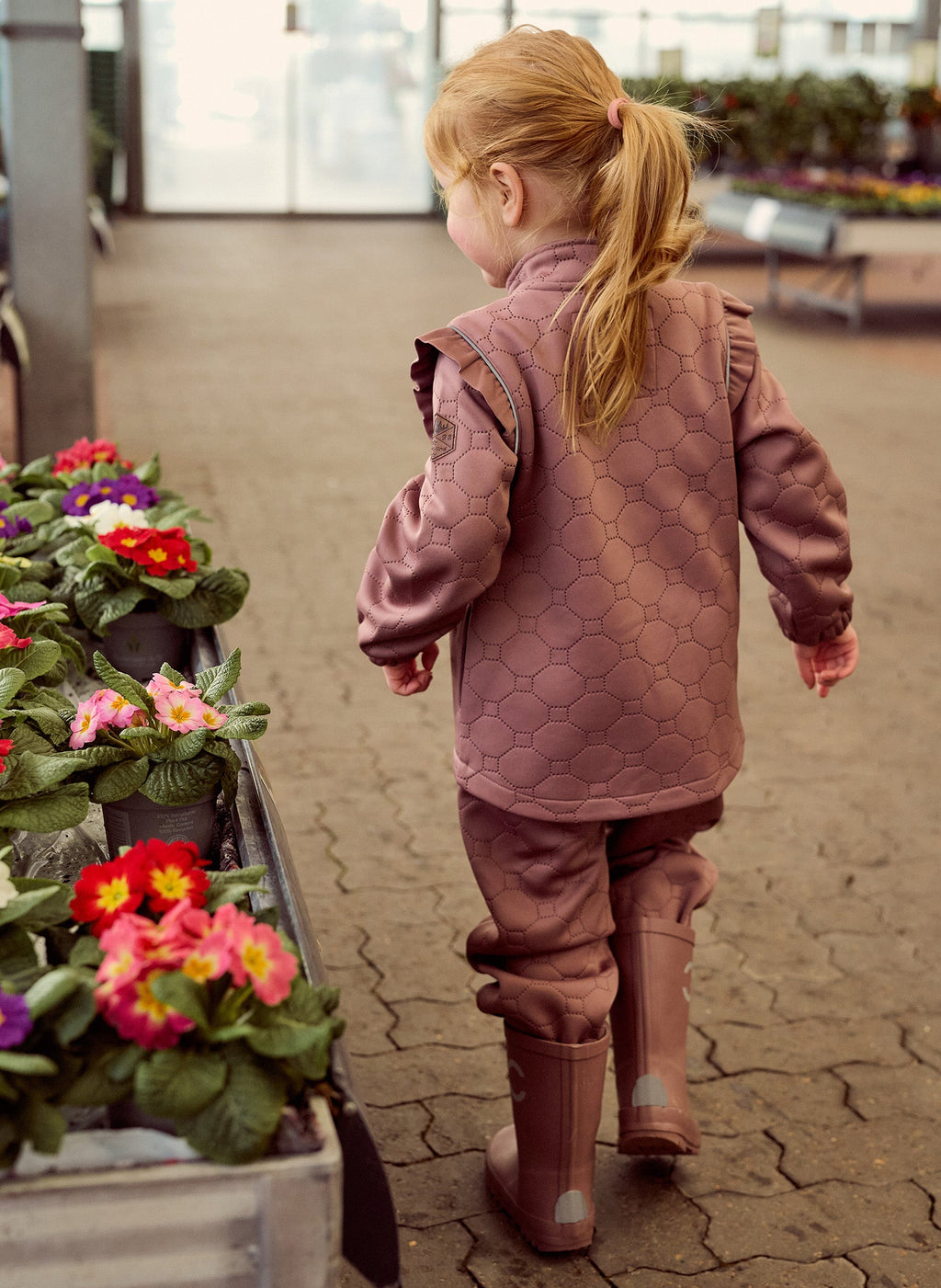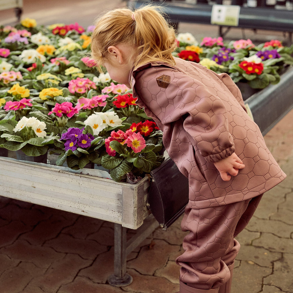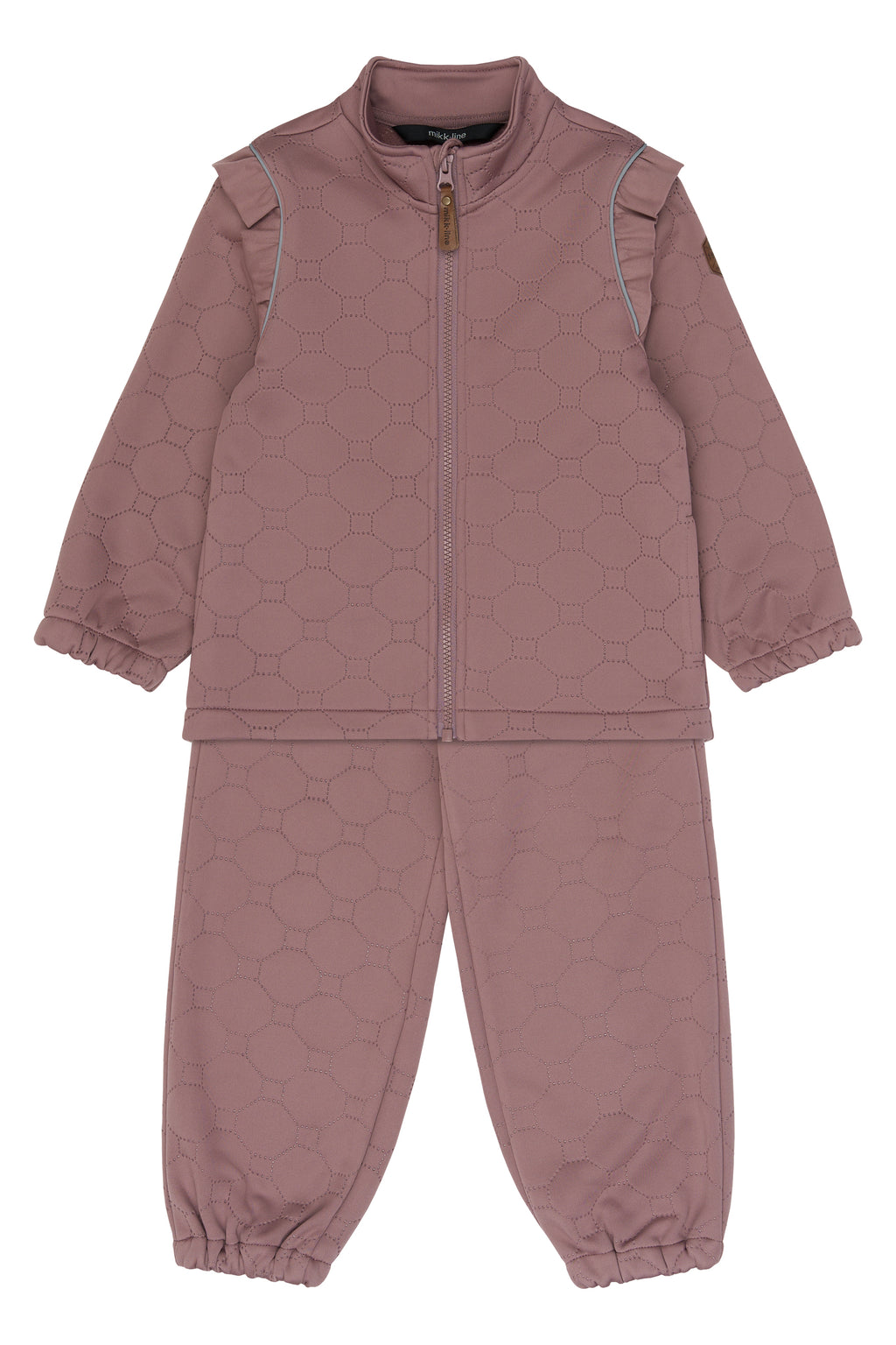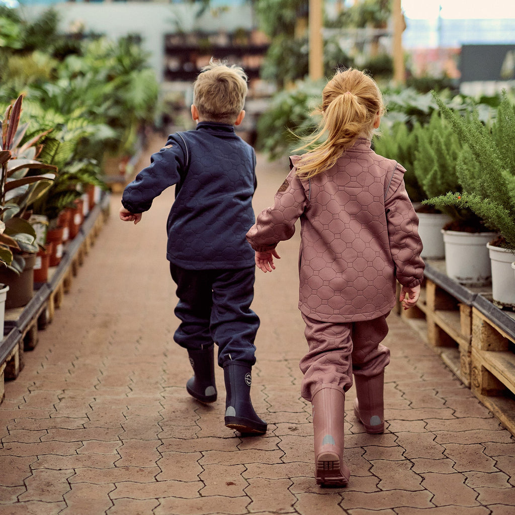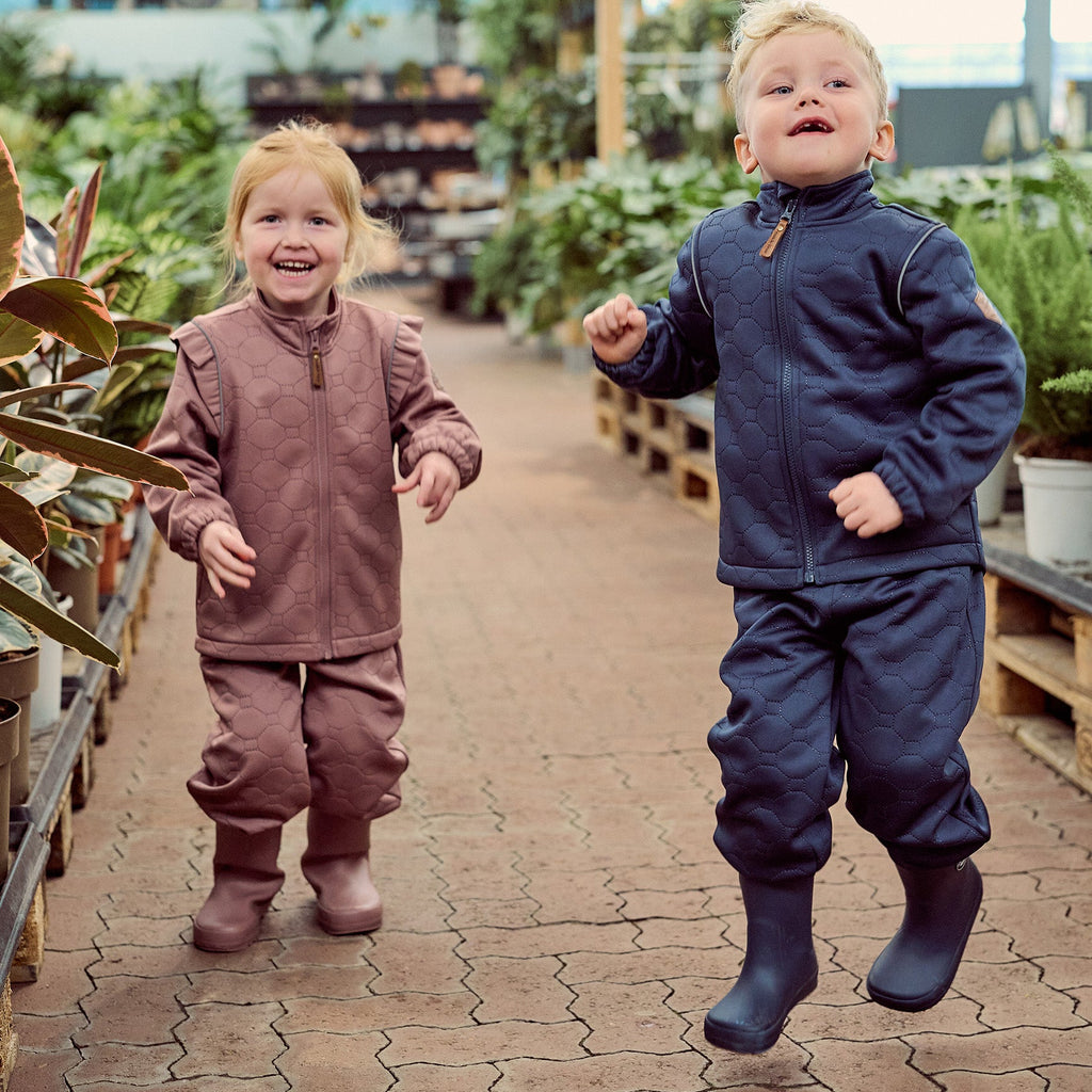 Sættet er fremstillet i isolerende polyester, der hjælper med at holde på varmen uden at føles tungt. Det åndbare materiale regulerer temperaturen, så barnet forbliver komfortabelt - både under leg udenfor og som ekstra lag under overtøj.