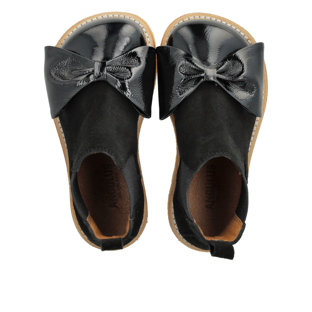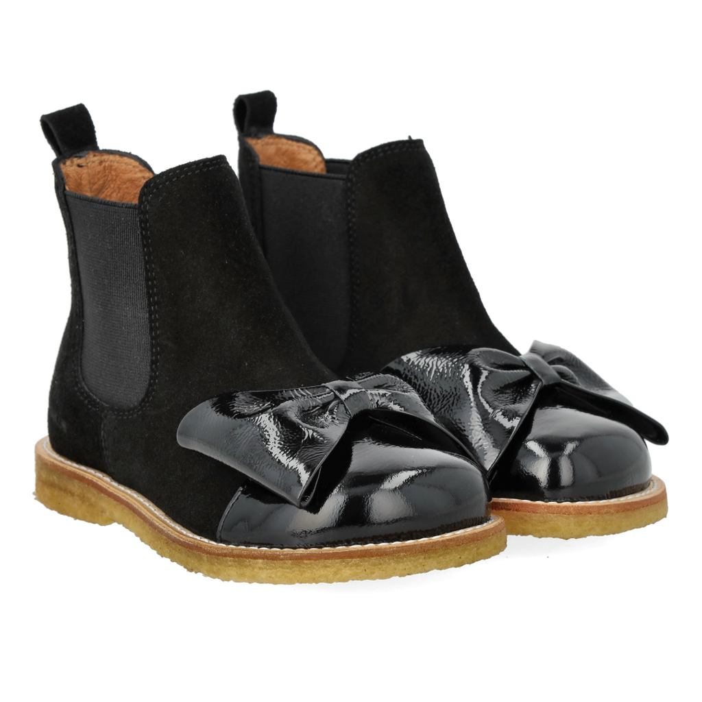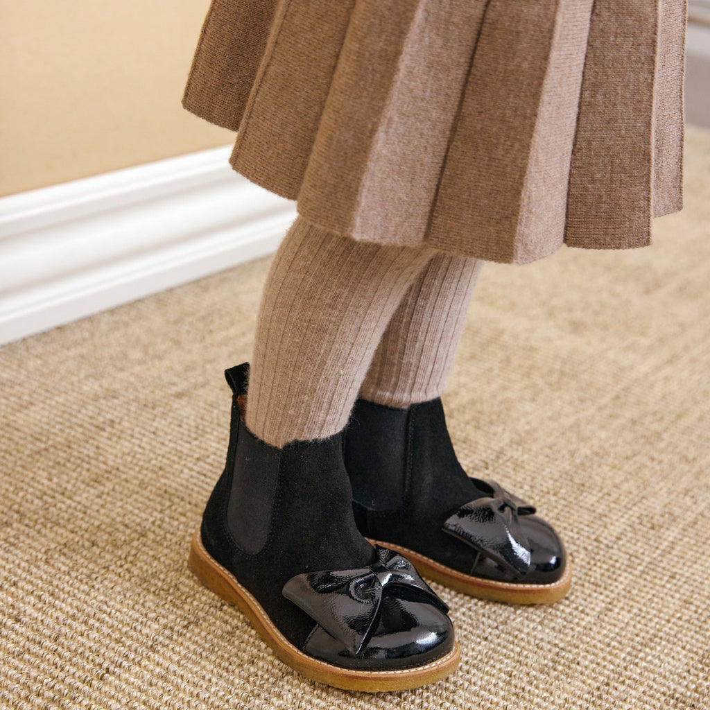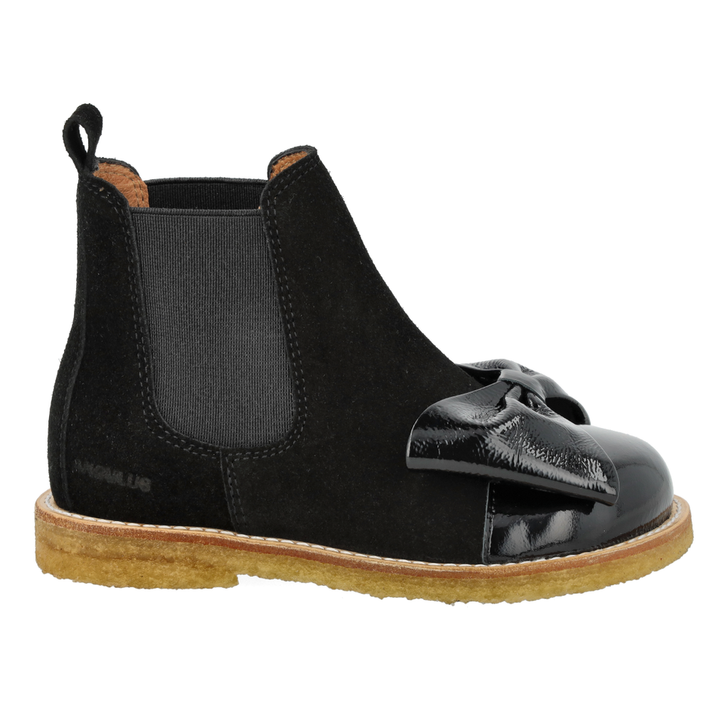 En klassisk Chelsea-støvle med et elegant og legende twist. Denne smukke Chelsea-støvle fra ANGULUS er fremstillet i blødt ruskind med en blank laksnude og en fin sløjfe, der giver et tidløst, men charmerende udtryk – perfekt til både hverdag og festlige anledninger.