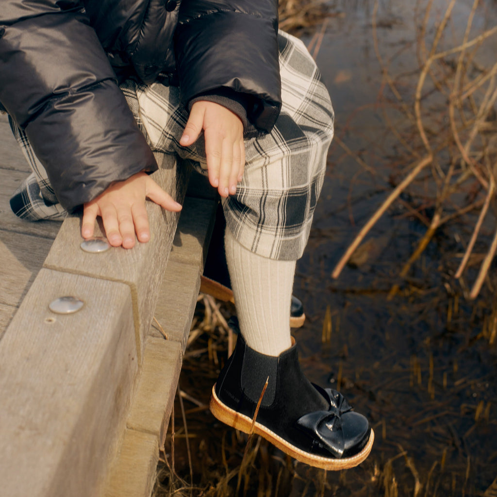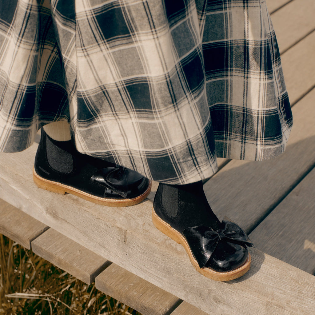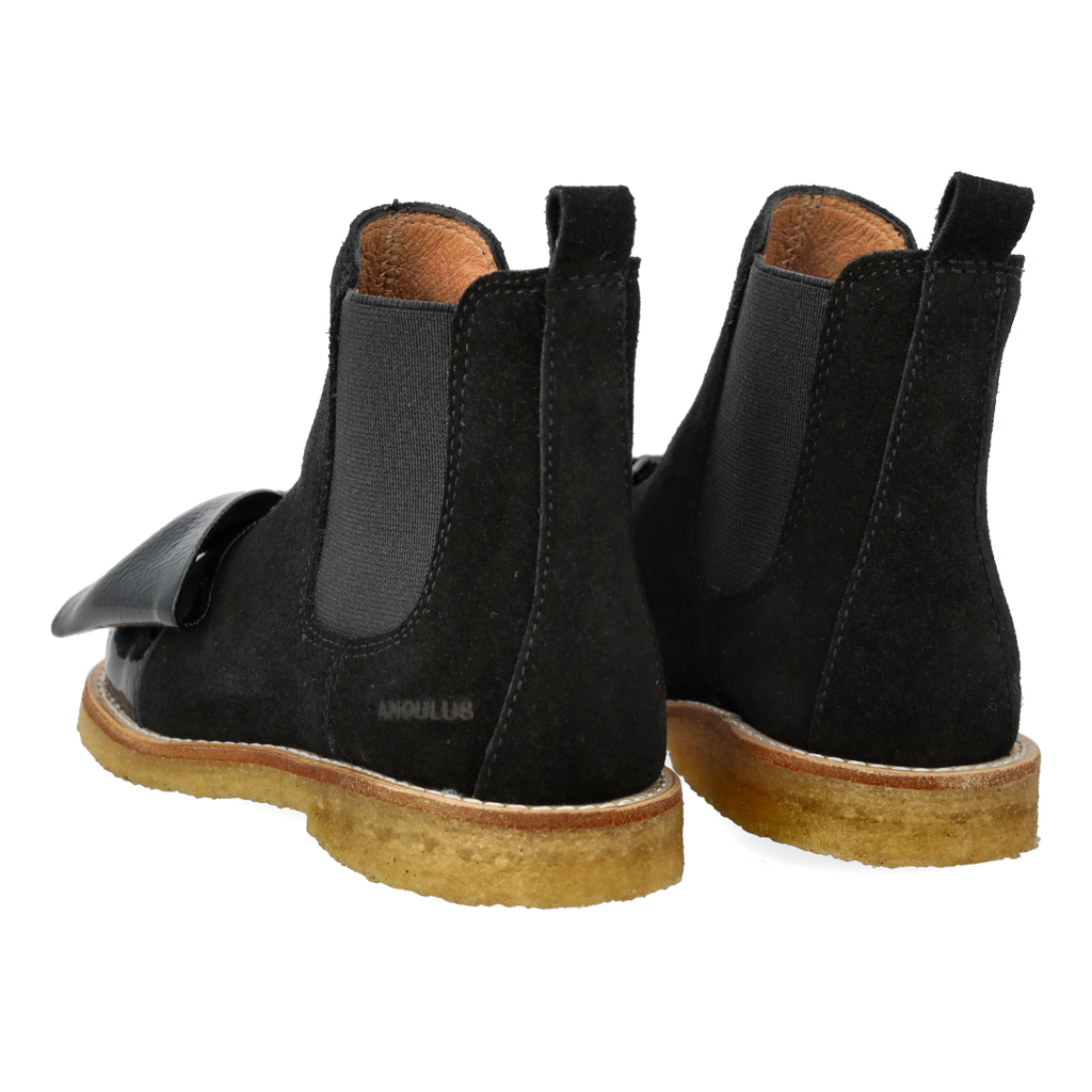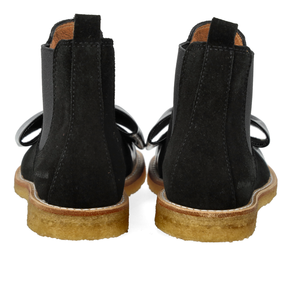 En klassisk Chelsea-støvle med et elegant og legende twist. Denne smukke Chelsea-støvle fra ANGULUS er fremstillet i blødt ruskind med en blank laksnude og en fin sløjfe, der giver et tidløst, men charmerende udtryk – perfekt til både hverdag og festlige anledninger.