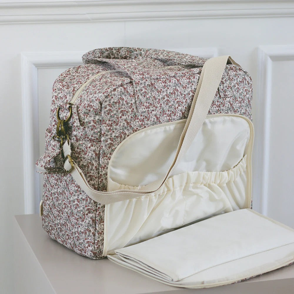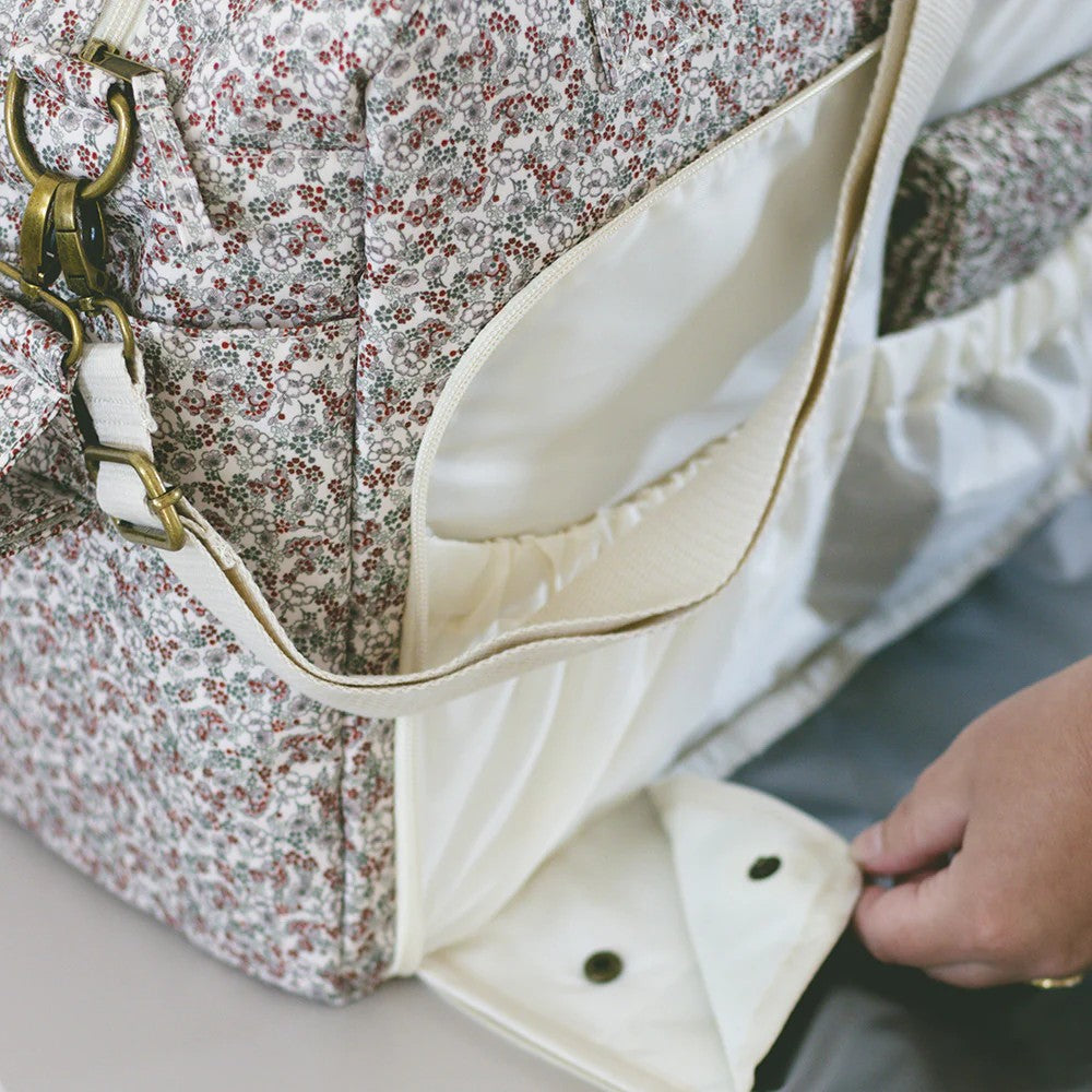Benne-tasken har en stor udvendig lomme, der rummer et praktisk og aftageligt skifteunderlag. Underlaget kan nemt desinficeres med sprit og knappes af, når det ikke længere er nødvendigt, så lommen i stedet kan bruges til en tablet eller computer. Den solide bund sikrer stabilitet, og taskens rummelige opdelingslommer giver god plads og overblik over bleer, tøj og andre nødvendigheder. Tasken er desuden udstyret med en termo-lomme, der holder drikkevarer og mad enten kolde eller varme.