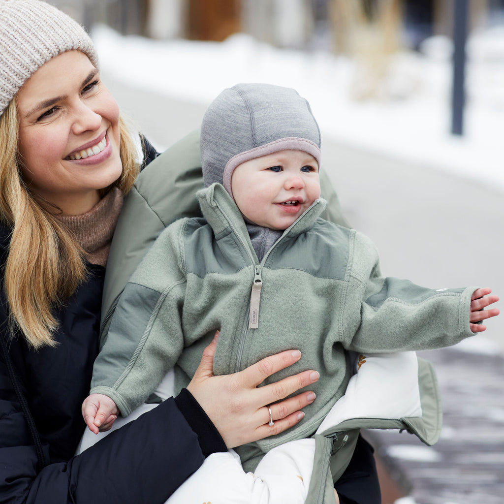 Den tykke uldfleece af merinould føles utrolig blød mod huden og giver en naturlig varme, samtidig med at den lader huden ånde. Uldens temperaturregulerende egenskaber sikrer, at barnet ikke bliver for varmt eller fugtigt, men holder en behagelig og stabil kropstemperatur – uanset aktivitetsniveau.