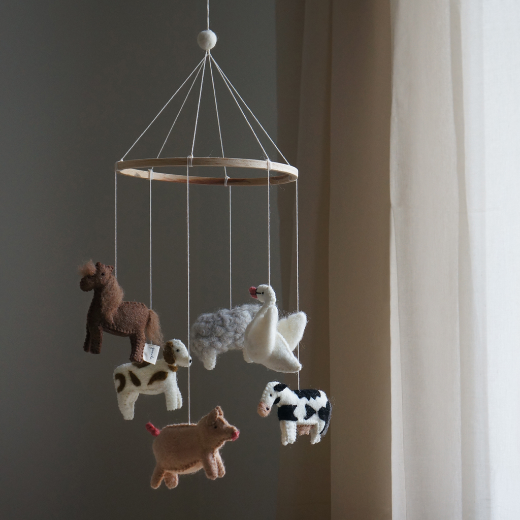 Gamchas uroer bringer en helt særlig magi ind på børneværelset. De er håndlavet af kvinder i Nepal, og hver lille filtfigur rummer fine detaljer og et udtryk, der emmer af varme og nærvær. Når uroen bevæger sig stille i luften, skaber den et blidt visuelt fokuspunkt, som babyen kan fordybe sig i – perfekt til at stimulere sanserne på en rolig og naturlig måde.