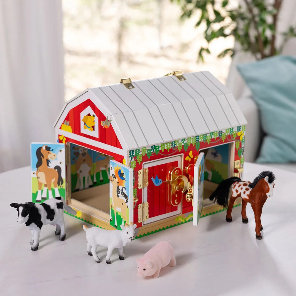Denne engagerende aktivitetstald fra Melissa & Doug inviterer til kreativ og lærerig leg med hyggeligt bondegårdstema. Den robuste stald i træ har 5 døre med forskellige låse, som barnet kan åbne og lukke - og bag hver dør gemmer der sig søde dyrebilleder.