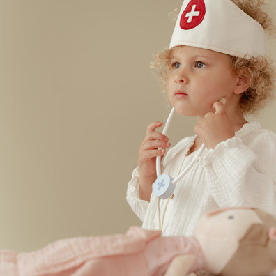 Sættet indbyder til fantasifuld rolleleg, hvor børn kan øve sig i empati, omsorg og tryghed – og samtidig blive mere fortrolige med rigtige lægebesøg.