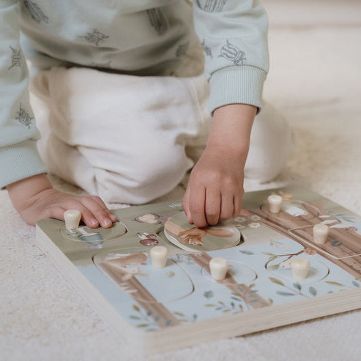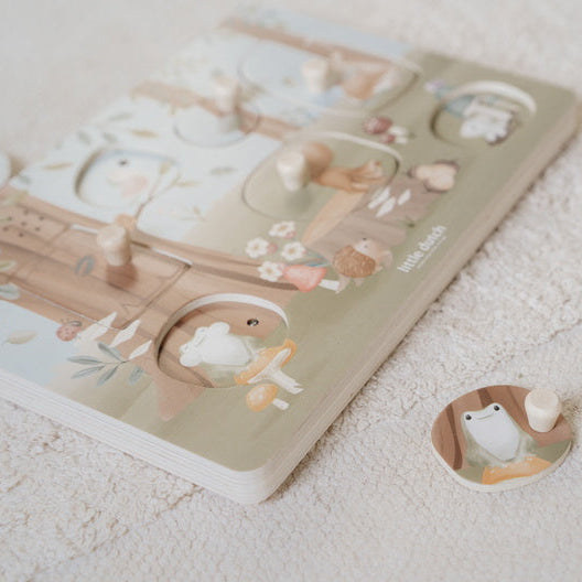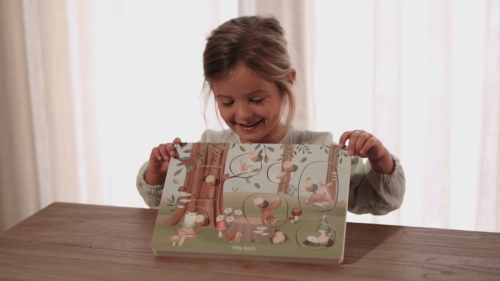 Puslespillet har 7 brikker formet som dyr, blade og svampe, og hjælper barnet med at udvikle hånd-øje-koordination, genkendelse og ordforråd.