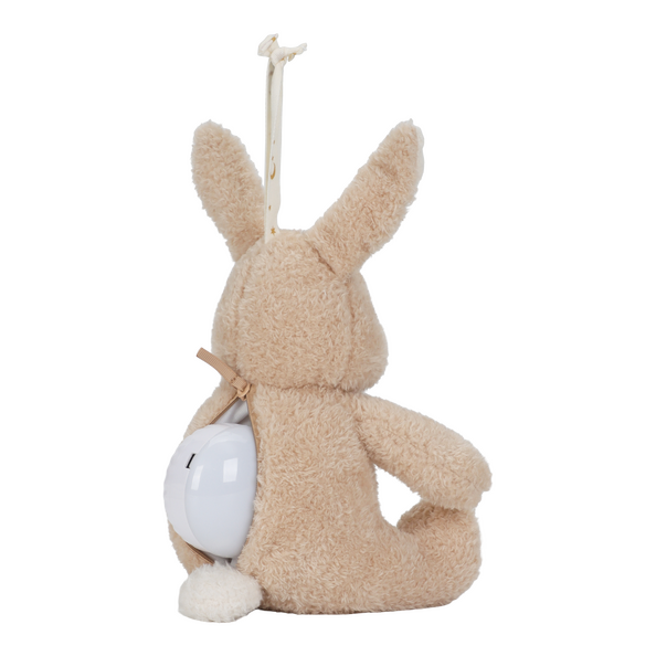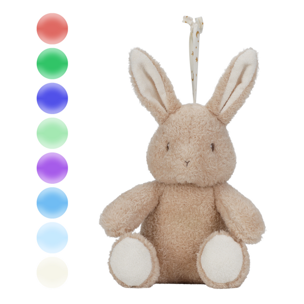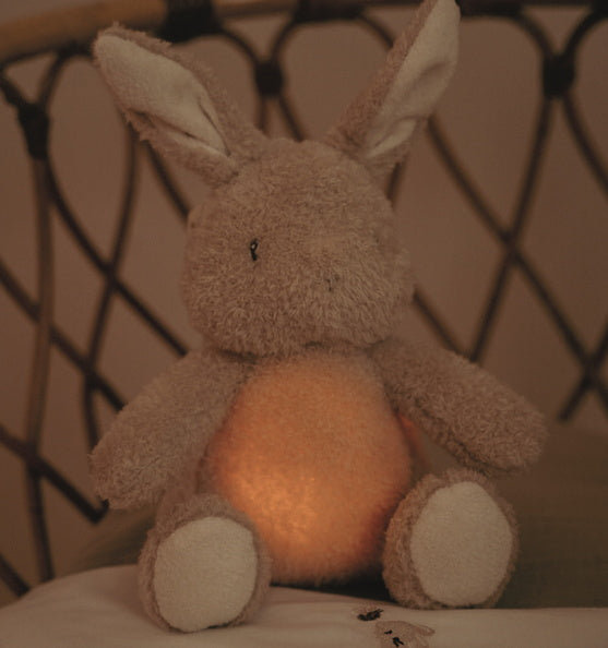 En ven til søde drømme – Kramme Kaninen Bunny giver kærlighed, ro og tryghed med sin blide glød og beroligende lyde. Vælg mellem en blød melodi, hjerteslag eller livmoderlyde, der hjælper barnet med at falde til ro og sove trygt.